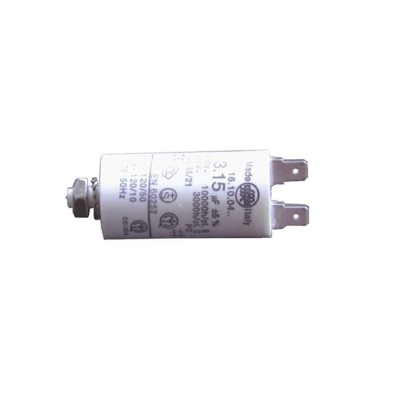 Bajo TENSION en permanencia, aseguran al motor un suministro de una fase auxiliar. El voltaje mencionado sobre el cuerpo de los condensadores no tiene nada que ver con la TENSION sector. La sustitución por un condensador de voltaje superior es posible, pero no el contrario. Si el condensador de sustitución tiene una capacidad en micro farad (µF) mayor o menor de 20%, el motor puede arrancar pero proporciona una velocidad y un par insuficiente, perjudicial para su longevidad. Entregado con kit conteniendo:- Tubo PVC - TENSION de servicio 400/500 volts alternativos - 2 bornes llanas a engastar 6.5 - 1 tuerca para fijación