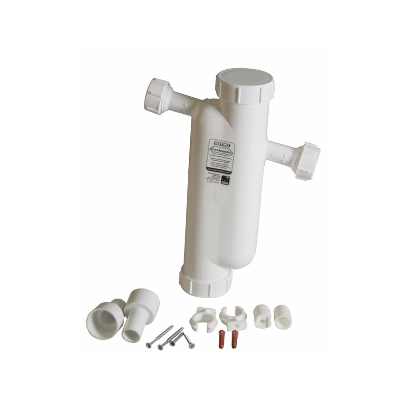 Neutralizador de condensados para calderas con condensación fuel y gas CARACTERISTICAS y VENTAJAS. equipamiento simple a instalar. Design único e innovador. Se adapta a todo tipo de calderas con condensación: Fuel y Gas. Neutraliza eficazmente los rechazos ácidos o condensados . No afecta el buen funcionamiento o el rechazo de condensados de la caldera . Para los rechazos ácidos nocivos al conjunto en la alcantarilla . Esto hace las calderas con condensación perfectamente ecológicas. Facil a limpiar y a mantener. Recarga facil a sustituir . No necesita cambiar la integralidad del Neutralizador. Empalme para tubo 25mm